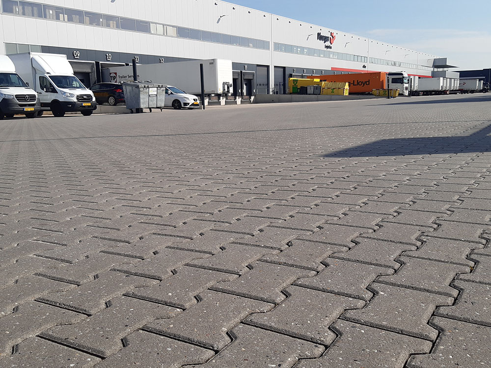 In Harderwijk verrijst een nieuw logistiek centrum van Ploeger Logistics Het project voldoet aan de BREEAM Outstanding norm met 5 sterren op gebied van duurzaamheid op gebied van waterbesparing, energie en gezondheid. Smink Infra b.v. zorgde voor de terreinverharding en Henken Infra leverde de stenen. H-profiel, dus stenen die bestand zijn tegen rangerende vrachtwagens en heftrucks. En met het mooie weer van vandaag levert dat een stralend plaatje op!